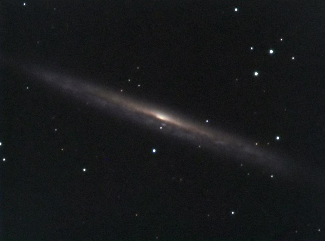 Comments: Taken during full moon. Average FWHM was 2,4 arc-seconds. Medium seeing and bad fst around 3,5mag only. Picture upsampled 15% for a better view. The diameter of this 13 mag. Sc-Galaxy is only 1,4x1,6 arc minutes. The faint star at three o'clock, 30mm away, is 20mag.